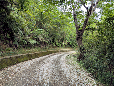 ![]() | 產業道路續往石空聚落行,目前正值桐花季節,道路上飄落滿滿的桐花。 |