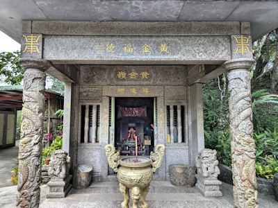 石空古道途中的黃金嶺福德祠,這座土地公廟是近期才用花崗石材改建,把原本的石塊小廟包在裡面,形成廟中廟的格局,原本的土地公廟據傳是取自福隆砂岩雕鑿而砌成,