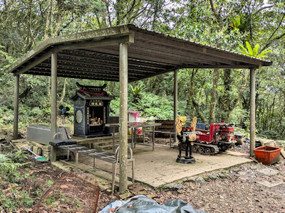 ![]() | 產道終點為「頂坪溪福德祠」,這間土地公廟也是百年古廟,廟前腹地的停車空間有限,就算你開四輪驅車上來,並不一定有位置可以停放,土地公廟座落在鐵棚內,廟埕設置有休息的鐵椅。 |