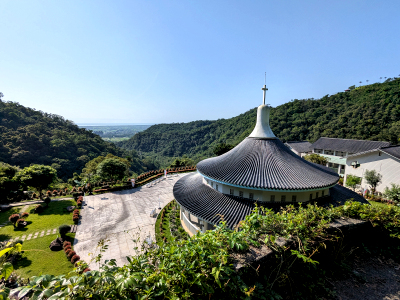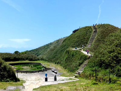 山莊前的廣場有座水池,應該是供蓄水防災用的,已多日沒有下雨了,水池裡都是雜草沒有儲水,前方的山峰稱為聖母峰平台,遠遠就可見到平台上的耶穌十字架。
