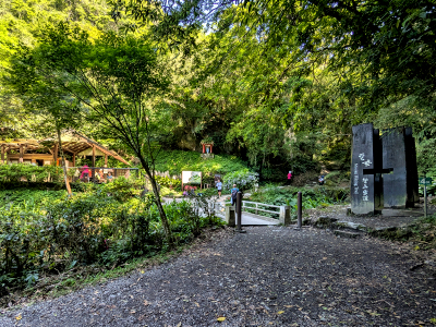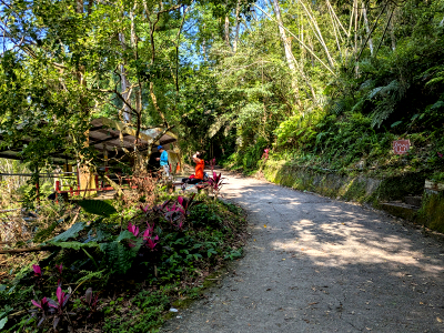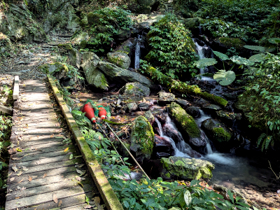 通天橋進入聖母登山步道,步道初期是走在得子口溪岸,沿途有綠樹遮蔽烈日,旁邊又有充沛溪瀑水氣,這一段步道是聖母登山步道中最舒服的路段。