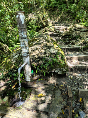 聖母登山步道 1K 處的山泉水供應點,佛心的設置,提供飲用水的取用,有些攜帶飲水不足的人,可以順道接飲急用,許多山友會在此取用,帶到聖母山莊煮水供泡茶、咖啡或煮食使用。