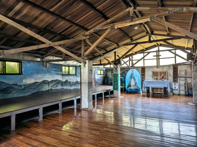 聖母登山步道 0.7K 處休息亭,這裡昔日也是簡易的山寮,之後改建成較完整的涼亭,內有羅東聖母醫院提供的急救品,有醫藥箱、擔架和 AED、醫藥盒、氧氣罐等,
