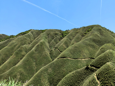 今天的視野真是棒,於聖母峰平台往三角崙山望,這就是所謂的抺茶山景觀,此景觀的形成主要是受地形影響,山頭長年受海風吹拂,整個山頭無法形成樹林,因此變成箭竹滿山頭的草山,