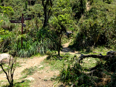 山徑來到鞍部的岔路口,登三角崙山直行進入稜線山徑,右側有條山徑為巴唐古道,是昔日的主要登頂路徑,巴唐古道的山徑較為難走,可以接回到聖母登山步道 0.3K 位置,