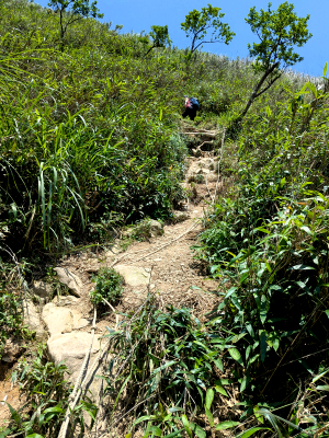 登頂三角崙山前,會先登上三角崙山東南峰,迎接山友的是一百多公尺長的陡爬山徑,這段陡山徑需要拉繩攀爬,往上攀爬或往下攀降只有一條山徑,中途會車就看誰要先讓行,