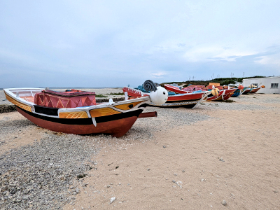 漁港碼頭旁的後寮海灘,擺放了五艘排列的船隻,每一艘船都精心的彩繪妝點,也算是很有特色。