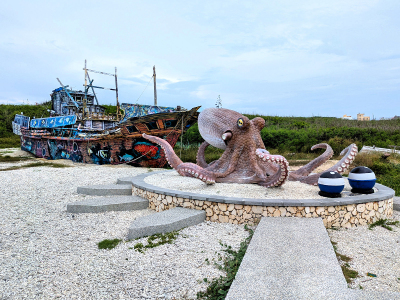 前往後寮天堂路前的石鮔章魚裝置藝術,主角是那隻章魚,後面配了一艘彩繪的漁船,路口旁是接駁至天堂路的搭車點,如果懶得步行的話,可以支付接駁車費用前往,接駁車是社區經營的。