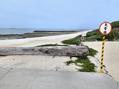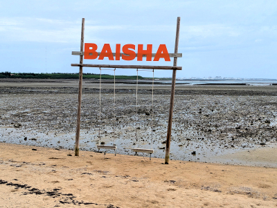 來到鎮海地區西邊的沙灘景點,沙灘上立了一座鞦韆架,這裡稱之為白沙鞦韆,鞦韆架上寫有BAISHA英文字,這處景點同樣要配合潮汐時段,沒有海水淹沒景觀,就缺少了海上鞦韆的氛圍。