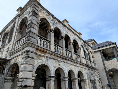 離開後寮地區往南來到鎮海地區,前往村莊裡的歷史建築「鎮海洋樓」,這棟洋樓確實非常的古色古香,目前還是有人居住的建築,其風格呈現中西合併,介紹是說仿金門的「五腳氣洋樓」,