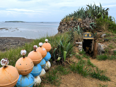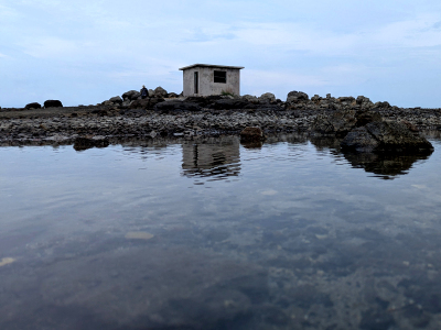 應該是退潮時,礁岩尚未全部露出,並且還可以步行涉水至崗哨小屋。