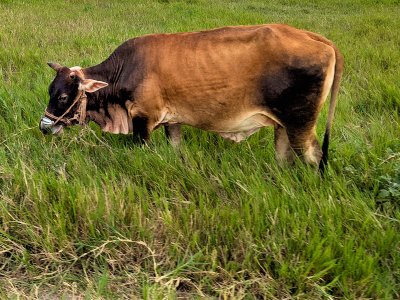 前往城前至大倉嶼涉水道的岸堤路徑上,會先經過一處牧牛場,這裡的牛是採野放方式放牛吃草,行車經過時要注意一下,免得發生不必要的意外。