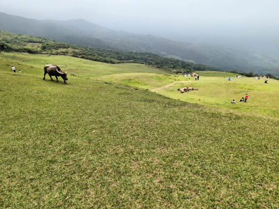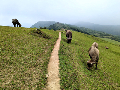 |  | 牛群悠閒的在草坡啃食,非常有昔日陽明山擎天崗的氛圍,曾經在陽明山區與野生水牛接觸過,野生的果然較兇暴,這放牧的水牛較溫順。 |