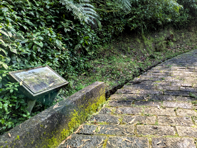 通過鐵橋來到對岸,步道旁植栽有整排的櫻花樹,邊坡處昔日有一座山神廟,現在只剩下標示牌;繼續順石階步道上行,將進入昔日的礦工寮聚落區,大部份的礦工寮都已毀損打掉,