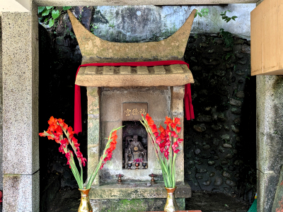 路口古樸的「平溪水尾福德宮」,土地公像是石刻的,這間石造的土地公廟也有百年歷史,名為水尾表示此地是水源的下游節點,附近沒有水圳也沒有溪流,應該是指基隆河平溪村落尾段,