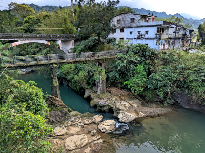 平溪老街十字路口往南騎行平溪街,平溪街經石底橋跨越基隆河接 106 號道路。