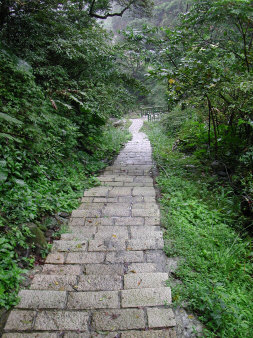|  | 大家在盤石嶺休息拍照了一陣子,接著應該要回程了,這次我們則跟著路條來走, 這山徑上的雜草不知是誰整理的,整條山徑看起來很清爽,依整理的情況來推斷, 若沒有人整理得話,那鐵定山徑兩旁將是芒草遮敝,有趣得是山徑是先下行, 之後又變為上行,又變為下行,景色還很相近,我們差點就被騙了,以為走錯了. |