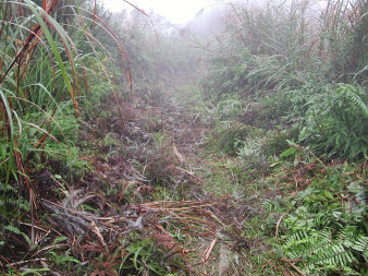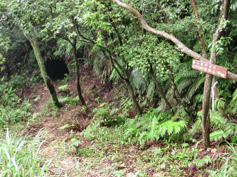 |  | 這下子要走那邊好呢?剛好探訪隊中有人帶手電筒,即然有手電筒可以用, 那何不走走有趣的路線,大家商議好後,選擇先探探右邊的山洞再決定吧, 這山洞裡面好黑哦,路面也很泥濘,不過有人在洞中放置一些樹幹供踩踏, 算是不難走啦,只是黑暗中心裡多少有點小恐懼,走出山洞後發現別有洞天, 而且也有明顯的路徑,依洞外的指示牌標記來看,順山徑走應該會到雲霧谷, 不過這裡山徑好像少人走,因為沒看到什麼路條,但是山徑看得出來是有整理, 雨後山徑顯得泥濘許多,但還不至於難走. |