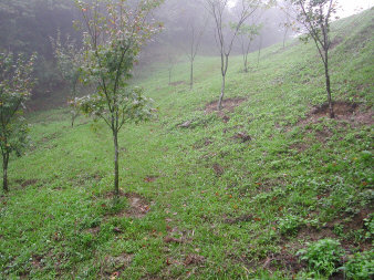 |  | 通過內板卡不久,走出一片芒草樹林後,眼前出現一處草坡,哇!好漂亮的草坡哦, 草坡上種植了數棵楓樹,其中還有櫻花樹,探訪隊的女生被這美麗的景色所吸引, 紛紛要求拍照,呵~男生也樂得有人當模特兒,反正數位相機是不需要底片的, 愛拍多少就拍多少,就怕電池沒電而以. |