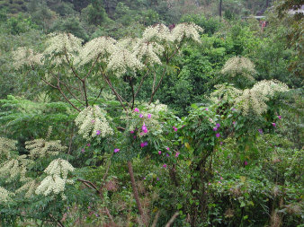 |  | 回菁桐火車站途中,看到農家田地上,有顆長了一串串白花的樹,剛好牽牛花攀於其上, 看起來很有趣,所以拍下來和大家分享,回到菁桐火車站差不多下午 3 點左右, 這時當然先吃個點心再回家,挑了一家菁桐小吃店家,進去點了大腸麵線來嚐嚐看, 唷!裡面還有羹耶,吃起來味道還不錯哦. |