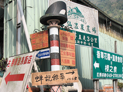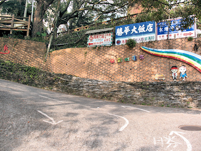![]() | 依指標方向道路上行,這個車道好窄喔,只能容一輛車子通過,道路兩旁有不少販售名產的店家,稍為掃瞄了一下,主要以香菇、高麗菜、茶葉及愛玉為主要商品。 |