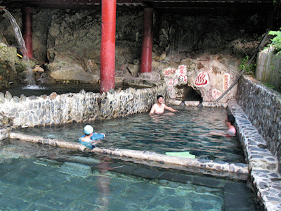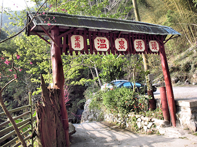 ![]() | 穿過東埔溫泉源頭牌坊,下行一小段路來到溪溝地帶,右邊有露天的溫泉泡湯池,池子的最裡面就是溫泉的出水口,旁邊則有引用山泉水調節溫泉水溫, 看了一下泡溫泉的價目,一人的費用為 150 元。 |