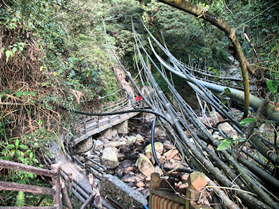 ![]() | 過吊橋後深入陳有蘭溪支流彩虹溪,步道跟隨著溪流而行,沿途大大小小的水管相伴,老實說還真的有點雜亂。 |