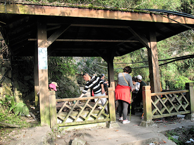 ![]() | 原本以為到了路底,因為角度的關係,只看到往彩虹瀑布的登山步階,等接近後才發現,步階旁又是窄窄只容一輛車的車道,心想在這裡開車的人技術都不錯, 時常要在斜坡的狀態會車及穿越窄道。 |