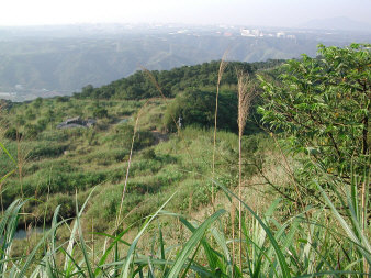 發現一處開闊的土堤視野不錯,爬上空隙的土堤,拍下遠望林口台地,這裡應該是比林口台地高的樣子. |