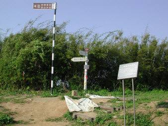 ![]() | 大棟山的山頭終於到了,第一個看到的是,三層樓高的塔建築,再加上電塔型的發射台,三角點及相關標示, 就在發射台的旁邊,原來大棟山又稱為龜崙山標高為 405M,和土庫岳一樣有一等衛星控制點,在三角點的旁邊, 有兩條用行道磚舖設的步道,右邊的步道通往元德寶宮,左邊的步道通往石灰坑山. |