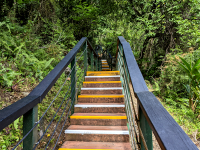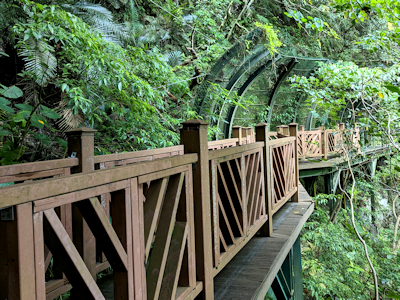 ![]() | 步行來到橋頭右邊的階梯步道口,路線是由此高架階梯下砂卡礑溪岸,順著小錐麓步道而行,步道終點經連絡道進入砂卡礑隧道,再經人行步道回到隧道口。 |
