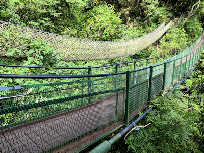 ![]() | 步道來到兩座吊橋處,想要有搖晃感覺的,就走繩索式的吊橋,怕搖的可走木棧平面吊橋,兩座吊橋都有安全維護,個人生性愛挑戰,所以走繩索式的吊橋, 走到中間位置真的搖晃很大。 |