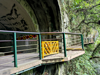![]() | 步道來到砂卡礑隧道體,外面的岩壁段,這處步道採用高架方式,沿著隧道體岩壁而行。 |