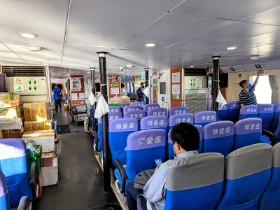 |  | 登船後選擇坐後倉,因為船艇在行駛時,前倉搖晃會比較劇烈,雖然出發前已有查過風浪,但去年的綠島有被暈到,心裡還是有點怕怕的;環顧船倉裡的情況, 感覺載運的貨物比人多,後方船板上還載運了兩部機車,若是不想租用機車,是可以載運自己的機車過去。 |