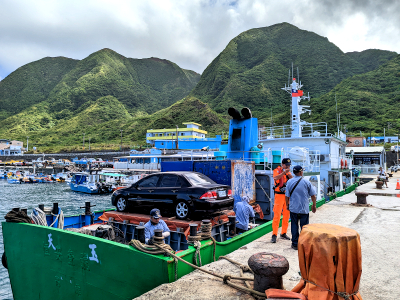 |  | 海上行駛兩個小時後,來到了蘭嶼開元港,這是主要往來台灣本島的客貨港口,下船後看到一艘載運汽車的貨輪,看來蘭嶼島上有人買新車。 |