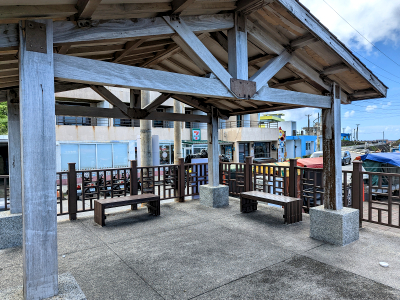 |  | 由開元港步行環島公路不到 200 公尺,就來到 7-11 蘭嶼門市,再過去還有一家海洋觀光超市,便利店內的格局跟本島一樣,挑選了餐點後自行微波, 因為疫情的關係,便利店內不開放內用,還好海堤處有座大涼亭,就在大涼亭中用餐,並且飽覽這蘭嶼的海天一色。 |