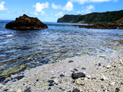 |  | 吃飽喝足了,海堤大涼亭下方有座海灘,就先來到此海灘逛逛,海水真的很清澈,這處沙灘還能看到各式的貝殼,如同見殼沙灘一般情景。 |