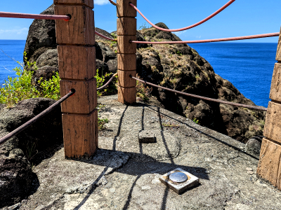 |  | 舊蘭嶼燈塔有水泥步階可達,燈塔前有二個基點,一個是水泥基石,另一個為開元港三等衛星控制點 V004 號,護欄外的岩塊似乎有路跡,是往岩角方向而去, 原本想越過護欄過去瞧瞧,後來放棄這個念頭,還是不要冒險的好。 |