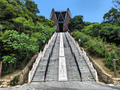 傻傻的我們還真的走祈福步道上山,好陡的階梯步道,步道終點為一艘船的造型。