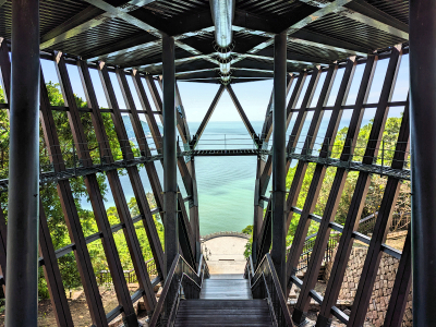 祈福步道進到船身意象內,船身結構是用鋼筋組成的,由此可看馬港海灣景色。
