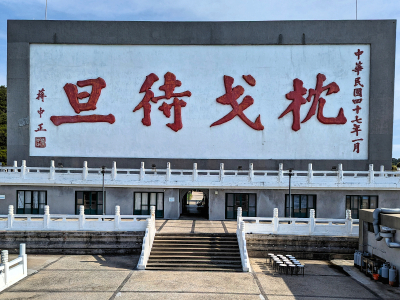 在南竿福澳港外,遠遠就可看見立在山頭的「枕戈待旦」照壁,原本以為是一面精神標語牆,現場一看才知是一橦五層的建築體,樓房立在南竿的福清嶺上,