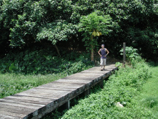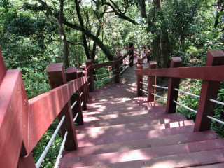 ![]() | 去年我由社區頭的步道入口進,由社區尾的步道出口下山,今天則給他反過來,登階行走在茂密樹蔭下的木棧步道。 |
