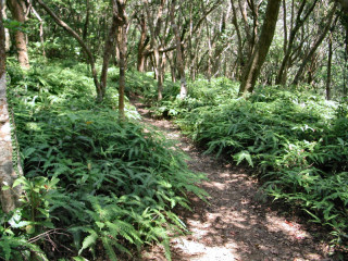 ![]() | 這條由山頂下往朝陽社區的山徑平緩易走,初期沿途皆是蕨類植物,山徑穿梭於樹林間。 |
