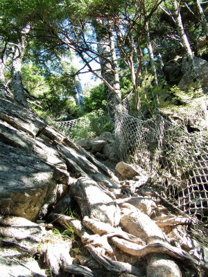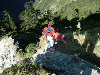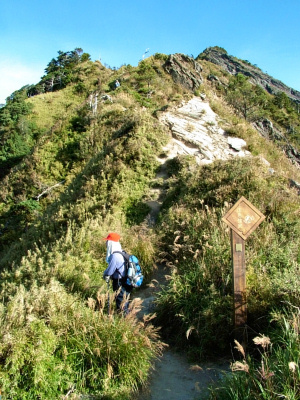 ![]() | 當見到有大塊岩石陡坡山徑,並且有架設安全護網之時,也就代表著山頂快到了,這也代表著又要開始陡攀的山徑路段。 |