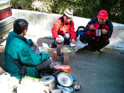 ![]() | 中午煮食麵食,吃飽才有力氣攻頂,今天狀況不太好的老恩,則是與雨傘大哥驅車前往梅蘭加油,剩下的五人繼續完成塔關山的攻頂任務。 |