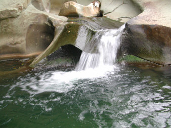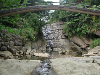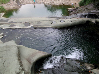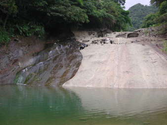 |  | 爬上了斜壁頂,這裡又是另一番景色,原來壁頂上有壼穴的地形,溪水流經此壼穴聚集, 再由壼穴滿溢流下斜壁,這個天然的大壼穴形成了如游泳池一般,感覺有像露天溫泉池, 旁邊有清涼的溪水一直注入,溪池中有許多的魚兒在悠遊,在這酷熱的盛夏裡, 泡在這清涼的溪水池中,只有一個爽字可形容. |