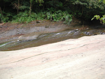 |  | 溪水很清涼喔,經由旁邊的淺潭爬上斜壁,這斜壁的角度不大,任何人都可輕易的爬上去, 若不是遇到平溪枯水期,則這整面的斜壁,將會是佈滿溪水,在這佈滿溪水的斜瀑上攀爬, 溪水沖激著全身,哇!十足的清涼啊,到了斜壁上頭再順水勢滑下來,這一定十分好玩. |