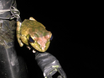 在屋前曬衣架上,發現到一隻水蛙,看這隻水蛙的樣子有點像樹蛙,一步一步爬著鐵桿上鐵鏈,