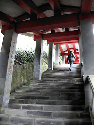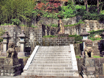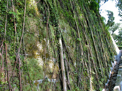 ![]() 主殿前階梯下的楓樹 | ![]() 爬滿樹根的石壁 |