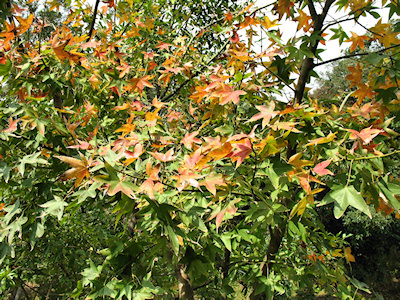 楓樹正呈現青綠黃紅交錯的楓紅現像。